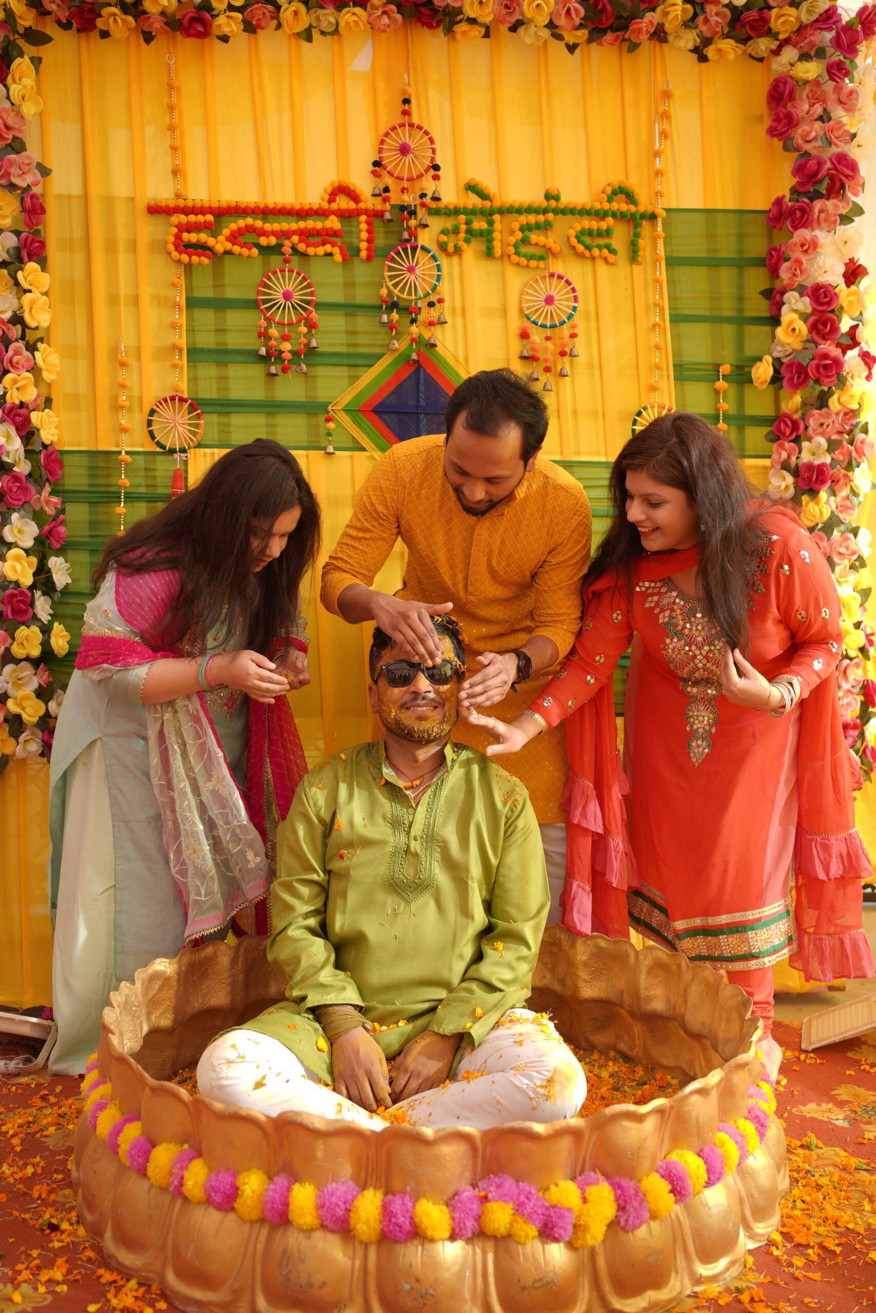 Vibrant hues, love's glow; Haldi moments, beautifully captured forever aglow.